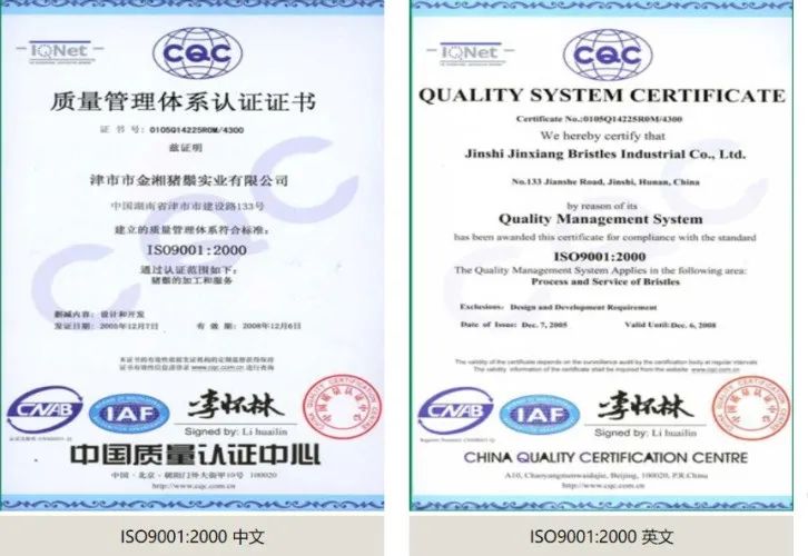 2005年獲得全國(guó)豬鬃生產(chǎn)行業(yè)第一個(gè)ISO9001:2000質(zhì)量體系認(rèn)證