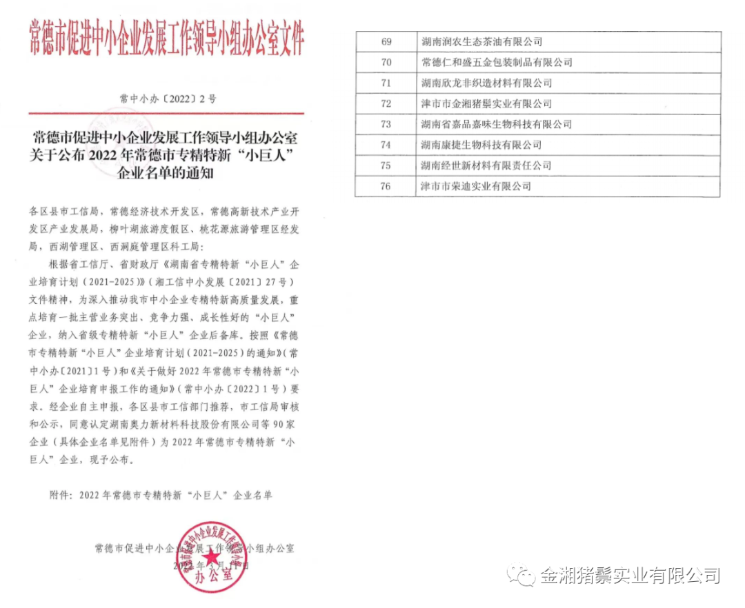 近日,常德市促進(jìn)中小企業(yè)發(fā)展工作領(lǐng)導(dǎo)小組辦公室公布了2022年常德市級(jí)專精特新“小巨人”企業(yè)名單,金湘豬鬃成功入選。